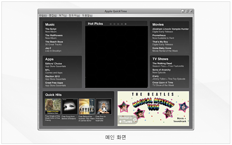 퀵타임(QuickTime) 다양한 미디어 플랫폼에 호환되는 동영상 재생 프로그램입니다. 스트리밍 미디어 지원, 서라운드 사운드 지원 등 다양하고 유용한 기능을 가지고 있습니다.