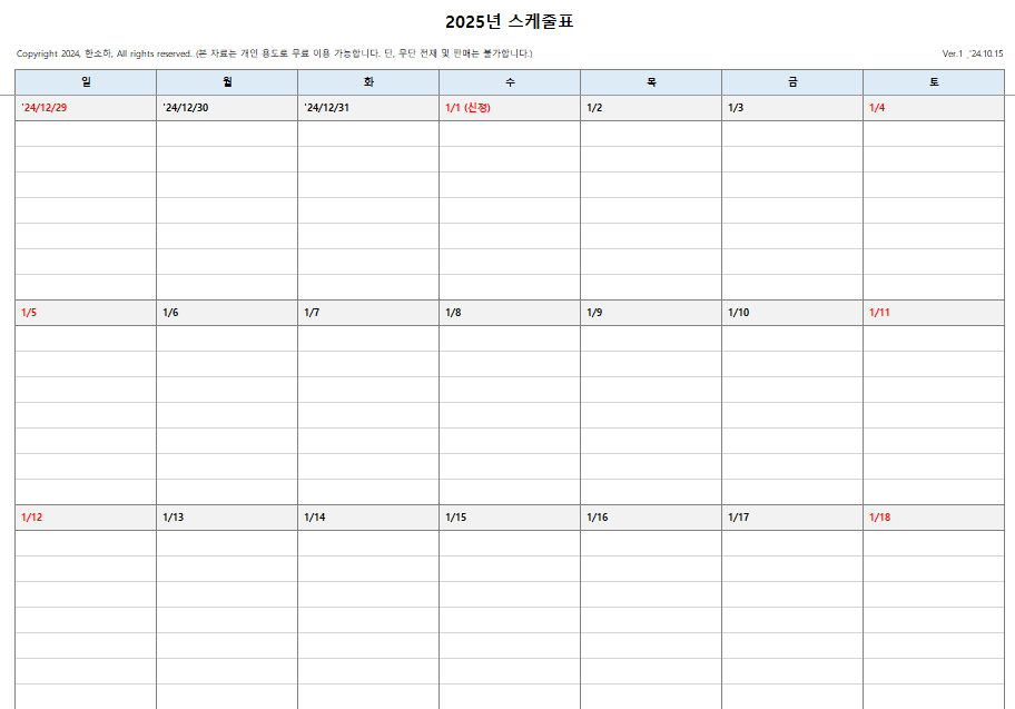 이번에는 2025년 달력 엑셀 버전을 소개해 드리겠습니다. 엑셀 버전의 장점은 편집이 가능하고 셀별로 날짜가 적혀있어 아래에 일정을 적기가 편리한 것입니다. 엑셀 버전 달력을 보려면 엑셀이나 엑셀 뷰어 프로그램 있어야 합니다.
