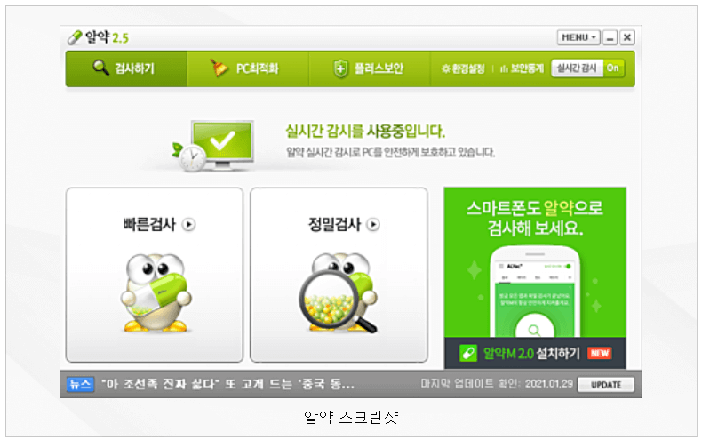 알약은 우리나라의 대표 백신 프로그램인데요. 악성코드의 탐지와 치료 기능을 제공하며, 높은 탐지율과 빠른 검사 속도를 자랑합니다.