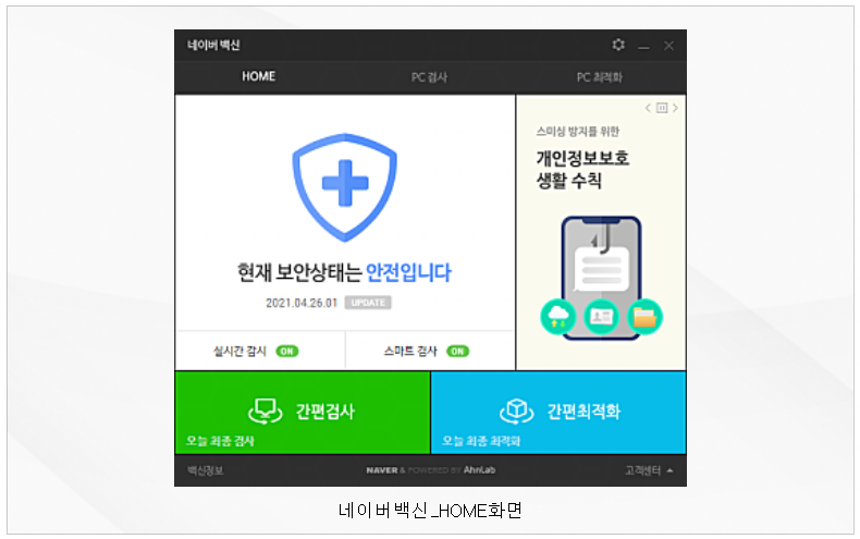 * 네이버 백신을 실행하여 '간편 최적화'를 클릭만 하면, 자동으로 PC 최적화 작업을 실행하여 편리하게 원활한 PC환경을 유지하실 수 있습니다.