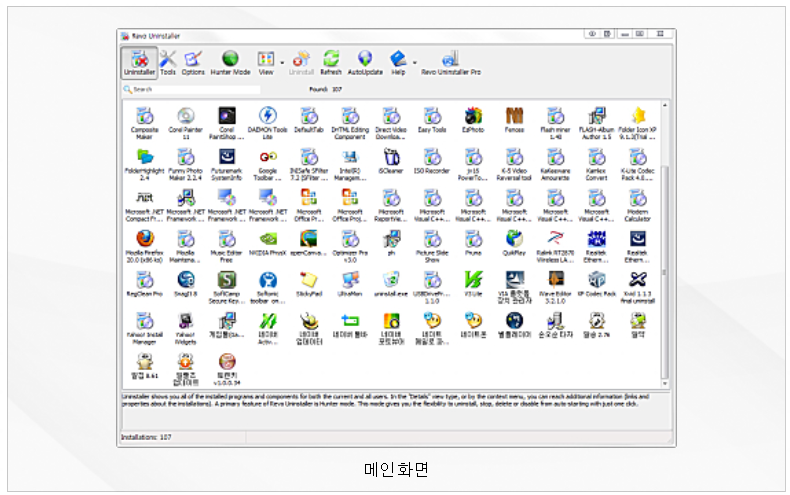 프로그램을 제거 할때 설치된 프로그램의 언인스톨러를 이용하여 제거합니다. 그 후, 잔존하는 파일과 레지스트리를 검색하여 보여줍니다.